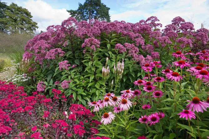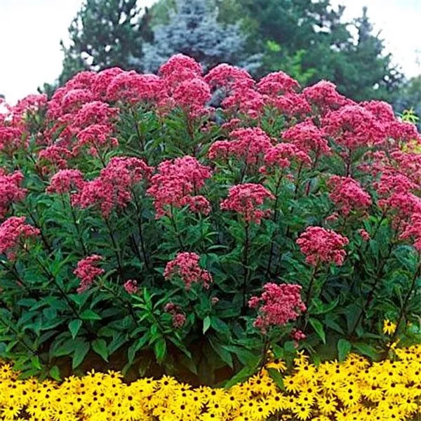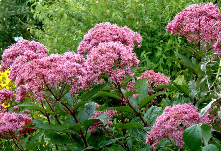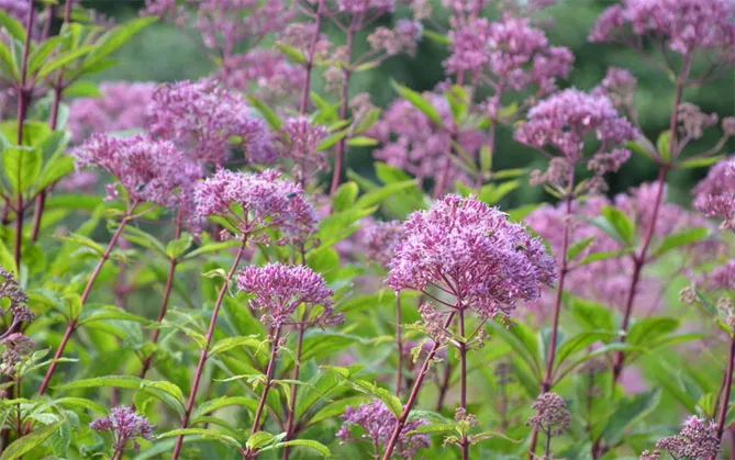 - Посконник пятнистый «Атропурпуреум» – самый популярный сорт с пурпурно-красными побегами и вишневыми цветами.