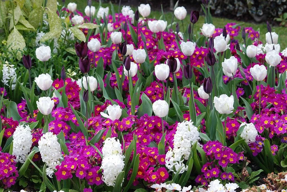 Первоцветы могут быть частью крупной цветочной композиции в сочетании с другими растениями. Как ранние весенние цветы, примулу садят с луковичными, цветущими в марте-апреле (гиацинты, крокусы). Такие композиции выглядят веселыми, пестря всеми цветами радуги.