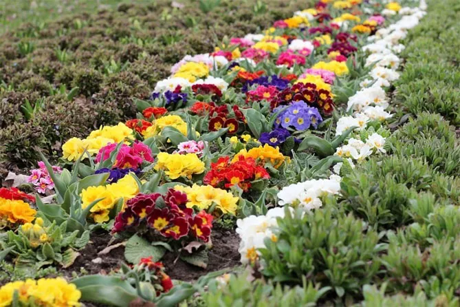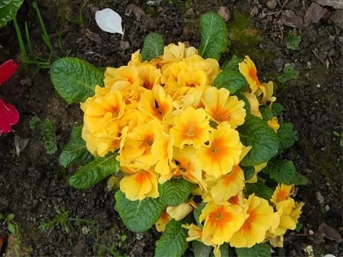 Самые сладкие цвета – желтый и оранжевый. Солнечная композиция из желто-оранжевых примул скрасит мрачные мартовские дни. К ним можно добавить анютины глазки в похожем цвете. Стоит дополнить клумбу вечнозелеными растениями (самшит, плющ).