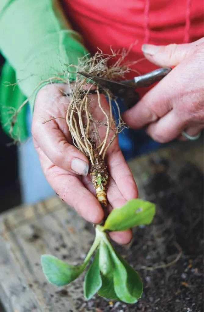 - Выкопайте (достаньте) растение из грунта, стараясь не сильно повреждать корни. Аккуратно разделите растение, чтобы каждая часть имела корни и побег. Разделяйте отдельные растения пальцами (отделять гораздо легче, если корни смочить водой).Удалите старые части, сухие, мягкие.