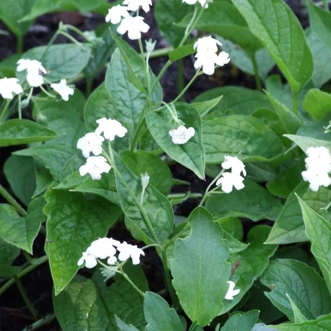 Сорт пупочника весеннего «Альба» (Omphalodes verna Alba) – чисто белый, цветет с марта по май. Высота – 20 см. Сорт, со слегка рельефной, опушенной листвой. Очень яркое растение в тени.