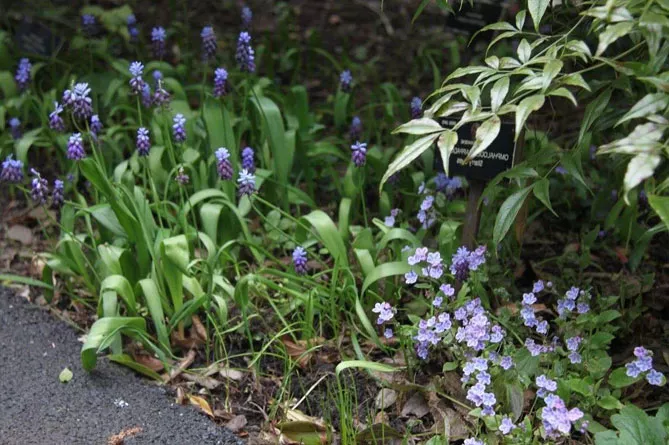 Дополните клумбу гейхерой или легкостью хаконехлои, чья молодая листва прекрасно сочетается с весенним цветением пупочника. Использование теневыносливых хост и папоротников усилит атмосферу подлеска.