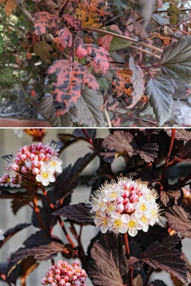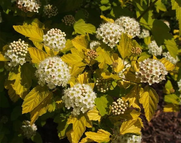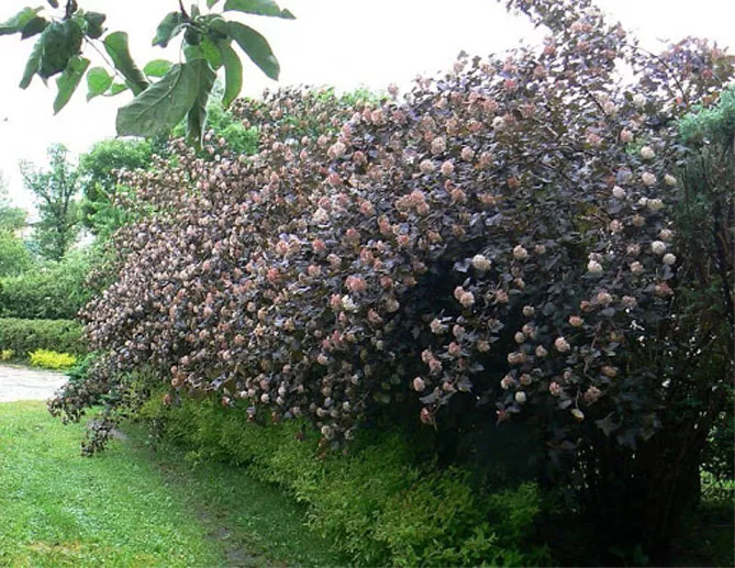 - «Самме вайн» Summer Wine – невысокий, шаровидной формы, компактный сорт с белыми цветками, появляющимися с июня по июль; высота куста – 2 м; весной листья становятся темно-пурпурными, осенью красновато-коричневыми;