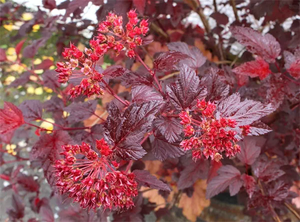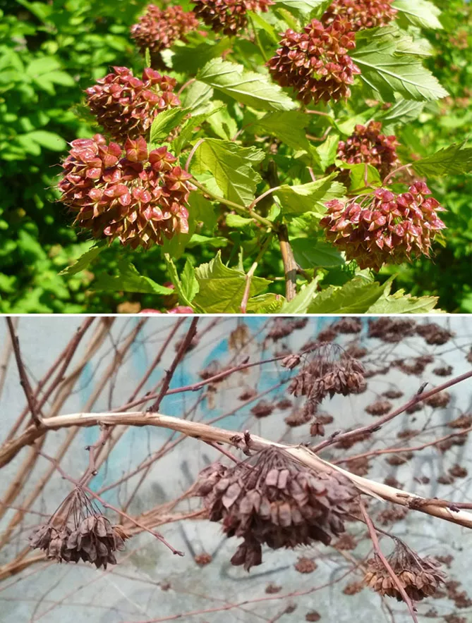 - Плоды несъедобные, пузырчатые, отсюда и название растения. В конце июня – начале июля цветки превращаются в раздутые плоды, чрезвычайно эффектные, сначала зелено-розовые затем бордово-коричневые. Количество цветов и плодов зависит от среды обитания. На солнце кусты цветут обильно, в полутени завязывают меньше цветов и плодов. Плоды в зависимости от сорта окрашены по-разному. У сортов с темно-красной окраской листьев плоды вишнево-красные. Плоды сохраняются на кустах всю зиму, обеспечивая декоративность и необходимую пищу для птиц.