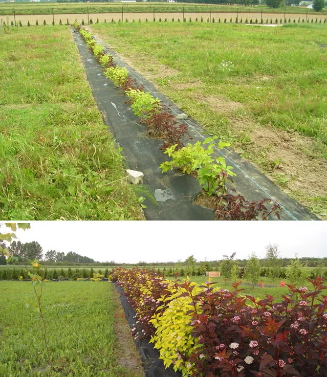 Фото. Схема посадки пузыреплодника на изгородь (с расстоянием между кустами 65 см) – фото при посадке и через 2 года.