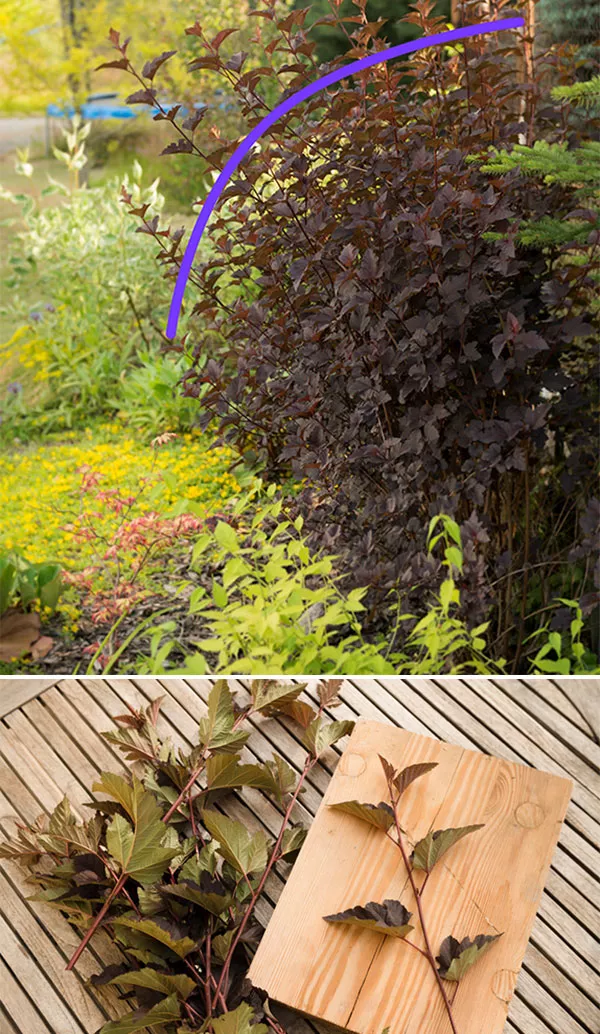 Фото. Схема обрезки пузыреплодника после цветения. Укоротите отцветшие побеги на треть: чуть выше ветвления или чуть выше сильного побега или боковой почки, направленной наружу куста.