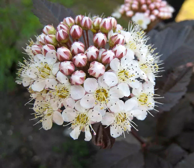 Когда цветет пузыреплодник? Поздней весной (май – начало июня) на побегах появляются мелкие, белые или розовые цветки, собранные в небольшие соцветия, выглядящие пушистыми из-за сильно выступающих тычинок. Цветки не особенно декоративны, хотя у некоторых сортов контраст, который они создают с листьями, значительно повышает их декоративную ценность.