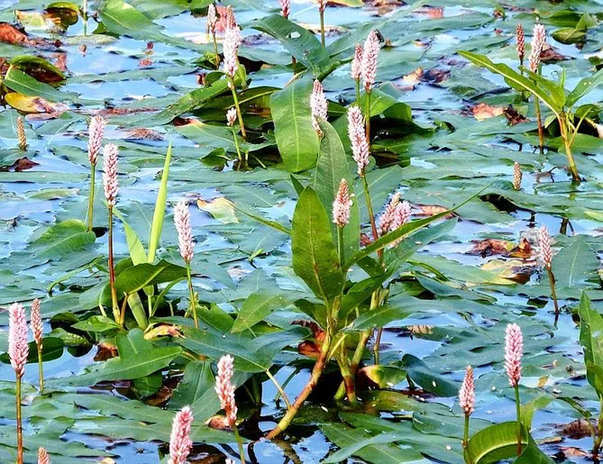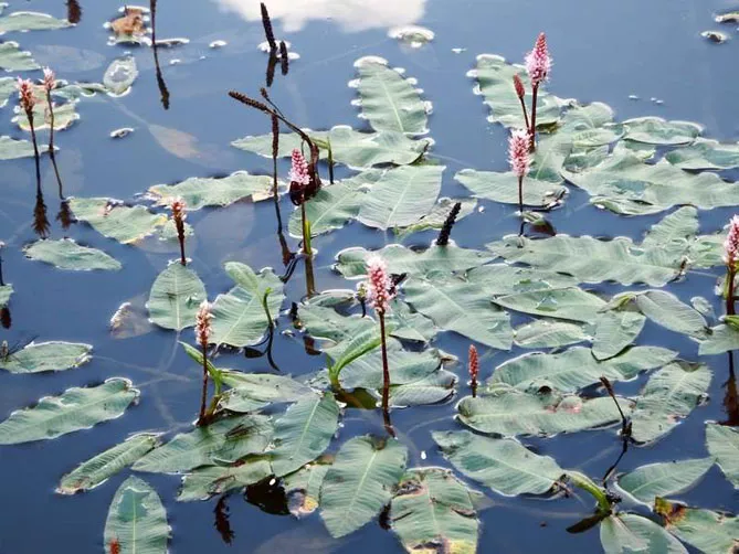 Хорошо приспосабливается к водной и надземной жизни земноводный горец (Polygonum amphibium) или водяная гречиха. Это многолетник с ползучим разветвленным корневищем. Встречается на мелководье 0-100 см, цветки и листья лежат на поверхности воды. Листья кожистые, продолговато-ланцетные, у основания сердцевидные. Розовые цветки до 5 см, появляются в апреле-сентябре над поверхностью воды. Они привлекают многочисленных насекомых, особенно стрекоз. Подходит для любого размера пруда. Хорошо растет на полном солнце и в легкой тени. Морозостойкость высокая.