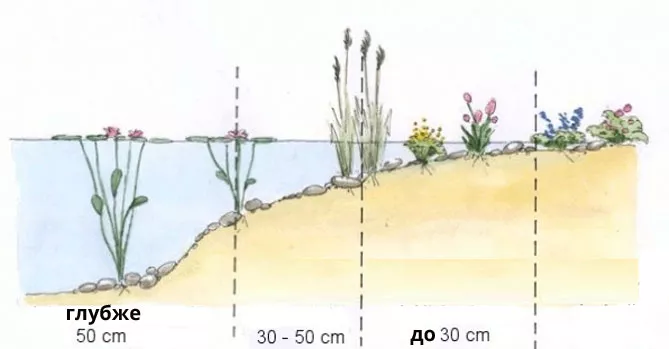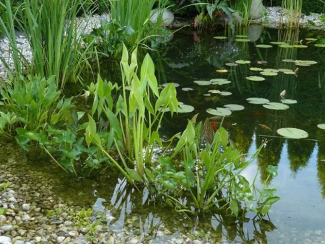 В зоне мелководья глубина воды составляет 20-30 см. Популярными видами растений, которые стоит посадить в мелководной зоне, являются следующие.