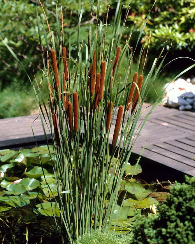 Рогоз (Typha) – высокая болотная трава, достигающая 1-2,5 м в высоту. Имеет небольшие удлиненные колосовидные соцветия, сначала зеленоватые, затем темно-коричневые. Существует много разновидностей рогоза. Самые популярные – широколистный и узколистный водяной рогоз.