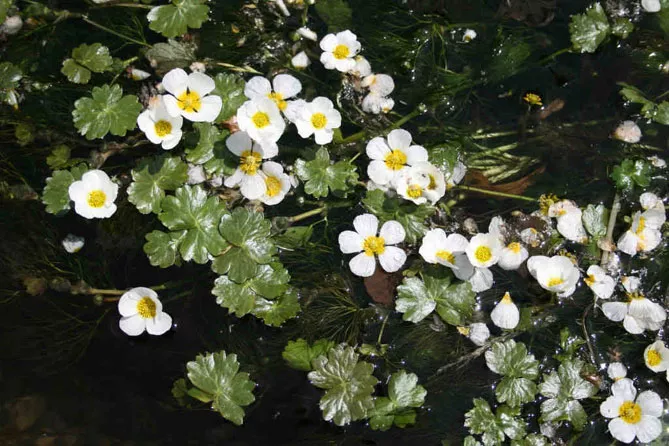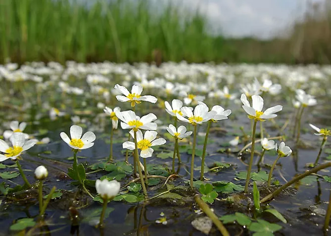 Цветы на длинных стеблях растут над поверхностью воды. Лепестки белые с желтым основанием. Длинные волоски покрывают основание цветка. Период цветения: май-август Высота: 10-50 см. Под водой цветки закрываются, а над поверхностью воды раскрываются и опыляются жуками и мухами.