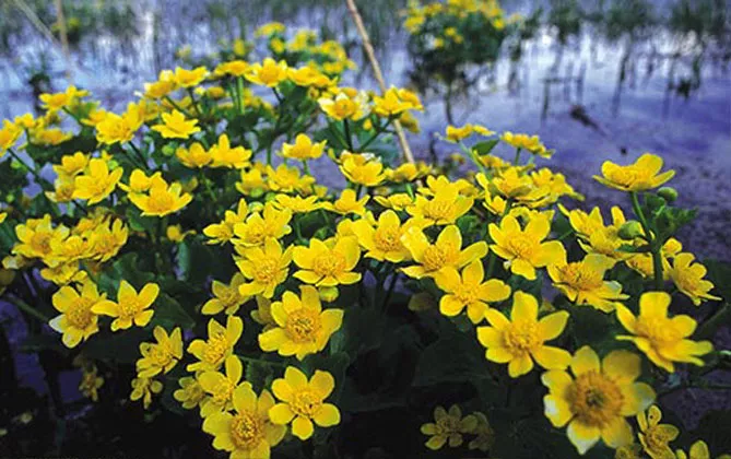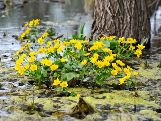 Многолетнее растение калужница болотная (Caltha palustris) имеет толстое, почти луковичное корневище. На этом корневище осенью образуются почки, из которых ранней весной вырастает надземный побег. Калужница подходит для края пруда. К почве требований нет, важно только, чтобы она была постоянно влажной, место должно быть солнечным. Размножается посевом семян осенью или делением разросшихся куртин (предпочтительно осенью). Болотный цветок цветет с марта по май или июнь. Растет на влажных лугах, берегах ручьев, в канавах.