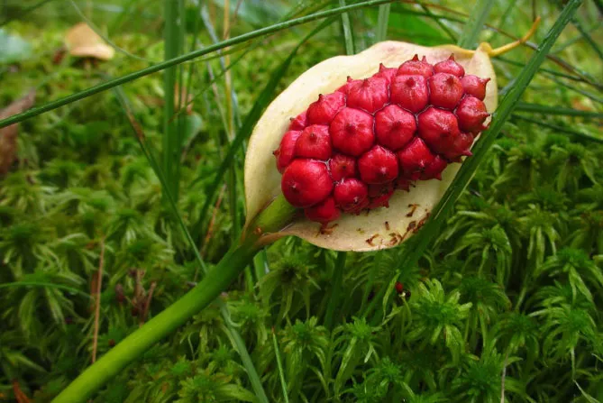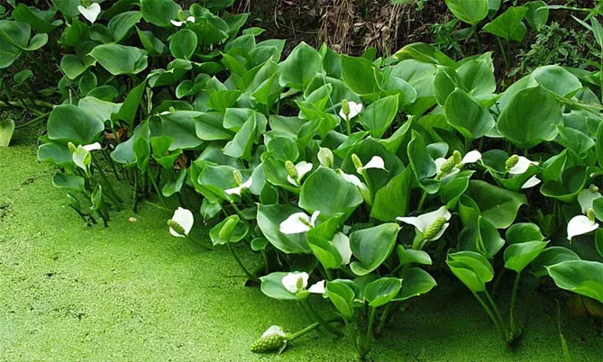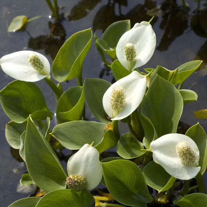 Эффектное многолетнее растение Белокрыльник болотный (Calla palustris), известное под несколькими другими названиями, в том числе водяная калла. В переводе с греческого его название означает «болотная красавица». У него белые цветы сердцевидной формы и глянцевые темно-зеленые листья. После цветения его плоды превращаются в красные ягоды, помещенные в початок. Отличается высокой устойчивостью к вредителям, хорошо справляется с неблагоприятными погодными условиями.