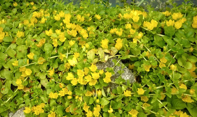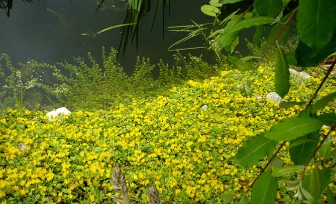 Классическое почвопокровное растение – вербейник монетный (Lysimachia nummularia). Его побеги могут достигать 50 см в длину, прекрасно маскируя края водоема. Имеет маленькие желтые цветы. Период цветения: июнь-август. Ему нужно обеспечить защищенное от солнца место.