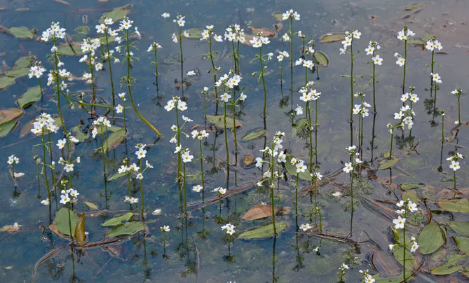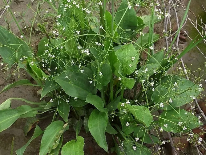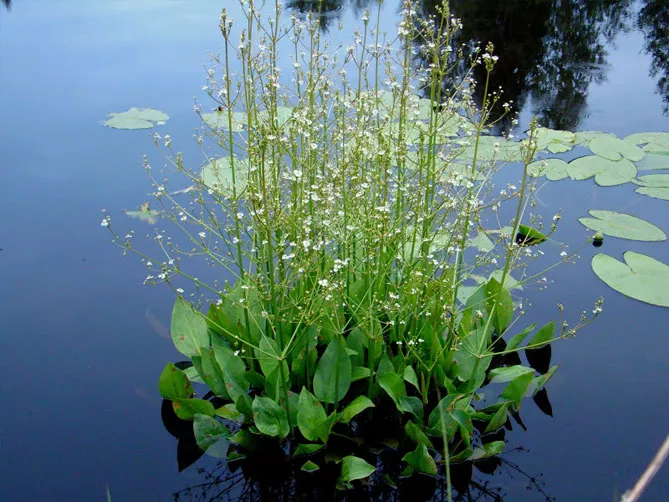 Алисма подорожниковая (Alisma plantago-aquatica) известная также под названиями водный подорожник или частуха подорожниковая – прибрежный многолетник с луковичным корневищем и стеблем высотой до 1 м. Подводные листья лентовидные длиной до 50 см, надводные листья с яйцевидной темно-зеленой пластинкой собраны в прикорневую розетку на длинных черешках. Цветки бело-розовые, мелкие, собраны во внушительные соцветия. Цветет с июня по сентябрь.