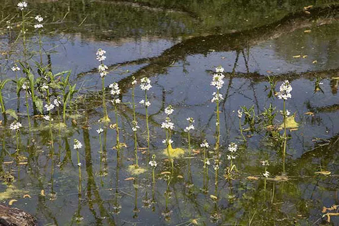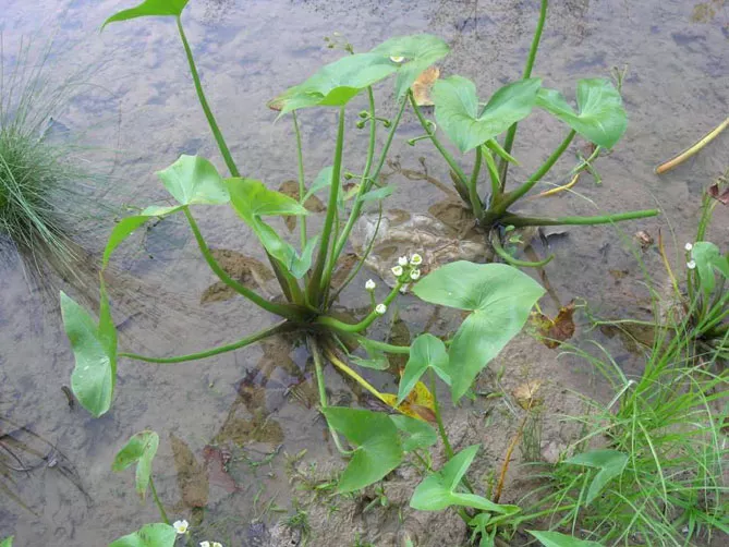 Одно из самых популярных растений, украшающих пруд – Стрелолист широколистный (Sagittaria latifolia). У него маленькие цветки с желтыми тычинками и широкими листьями. Обычно он растет на глубине 20-30 см, в некоторых случаях – даже на метровой глубине.