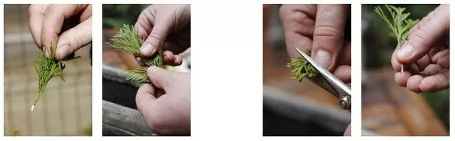 - Затем обрезают пятку наполовину и убирают нижние хвоинки до половины черенка. Оптимальная высота черенков составляет 10 см.