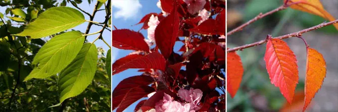 Фото. Листья японской вишни сортов: ‘Kalmthout’ «Кальмтаут», пурпурная листва ‘Royal Burgundy’ «Роял бургунди», осенняя листва Prunus ‘Okame’ «Окаме»
