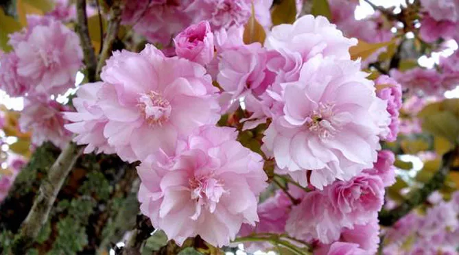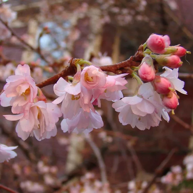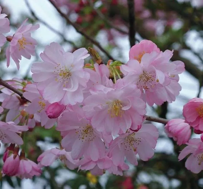 Высокорослая вишня косматая «Отумналис Розеа» (Prunus subhirtella Autumnalis Rosea) может иметь высоту около 5 м. Цветет в конце марта множеством нежно-розовых полумахровых цветов.
