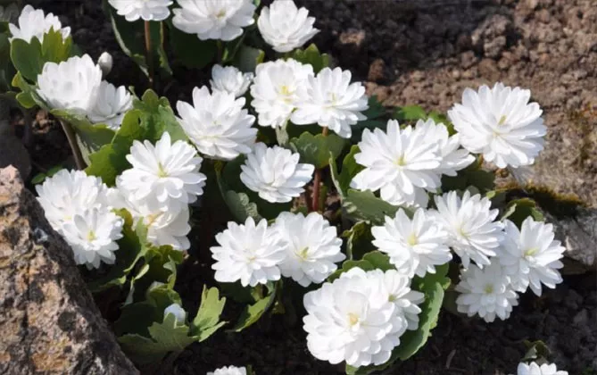 Сангвинария канадская (лат. Sanguinaria canadensis) – типовой и единственный вид рода с одиночными цветками. Цветок простой, белый, с 6-12 лепестками, цветет в апреле всего 15 дней. Лист крупный, бледно-зеленый, многолопастной, округлый. Это растение для полутенистых мест, для бордюров, клумб.