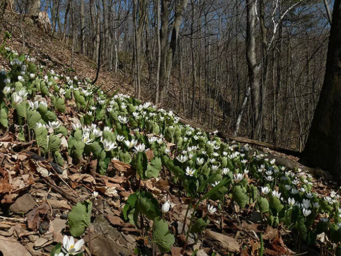 Sanguinaria canadensis – растение для легкой тени. Оно хорошо растет в прохладной полутени, но может выдерживать солнце в почве, которая остается влажной и не пересыхает.