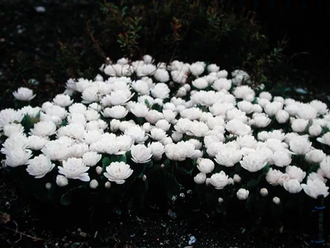 Махровая канадская сангвинария «Флоре Плено» (Flore Pleno) имеет красивый белый цветок с маленькими, махровыми лепестками в форме помпонов, цветет с апреля по май. Лист крупный, многолопастной, зеленоватый. Любит полутенистые участки, используется для бордюров, клумб. Зимостойкость (до -15 °C).