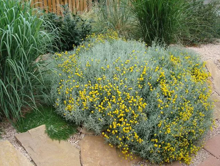 - Santa «Санта» – сантолина с круглыми кустиками высотой 25-40 см, листья — серо-серебристые, перистые, цветки – шаровидные желтые. Высаживают в солнечных местах.