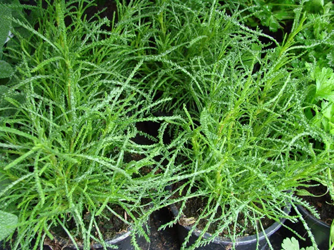 Многолетник сантолина виридис (Santolina viridis) – это вечнозеленое растение с ароматом черных оливок. Цветет с июня по сентябрь желтыми цветами. Вырастает до 20-40 см. Оливковая трава по вкусу и запаху напоминают маринованные оливки. Ее стоит выращивать как дополнение к итальянской кухне. Траву добавляют в салаты из помидоров, соус песто, в блюда из мяса и рыбы. Это лекарственное растение, используемое в фитотерапии и народной медицине. Оно стимулирует аппетит, увеличивает секрецию желудочного сока, облегчает пищеварение. Оливковая трава обладает отхаркивающим и противовоспалительным действием, поддерживает работу сердца.