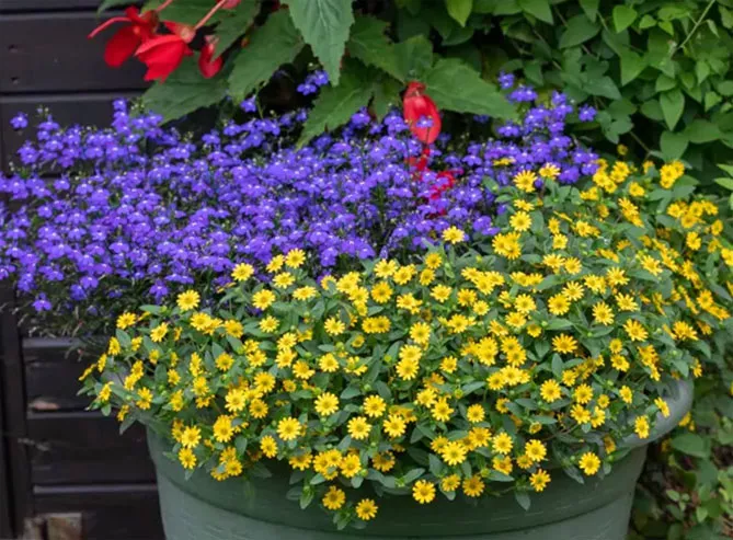 - сцеволаприятная, фиолетовые цветы которой приятно контрастируют с желтыми санвиталиями.