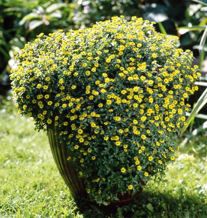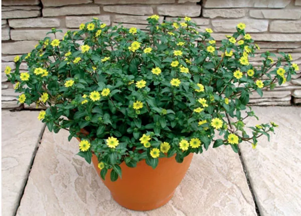 - Санвиталия распростертая (Sanvitalia procumbens) выращивается наиболее часто в садах, достигает 30 см высоту. Это интересное и популярное балконное растение, очаровывающее многочисленными желтыми корзинообразными цветками, напоминающими маленькие солнышки. Окраска цветков – от лимонно-желтой до оранжевой. Серединки (трубчатые цветки) могут быть темно-коричневыми, зелеными или желтыми. Существуют различные сорта санвиталии, большинство из которых просто желтые. Они отличаются лишь незначительным оттенком. Цветет через 10 недель после посева. Посев на рассаду проводят в марте-апреле или в сажают грунт до конца мая.