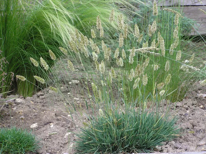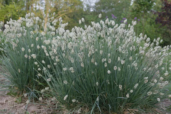 Небольшой, очень аккуратный вид Сеслерия серебристая (Sesleria argentea) цветет с мая по август. Высота в зрелости – 60 см. Вид с тонкой листвой, которая на ярком солнце имеет бледно-светло-зеленый или зеленовато-зеленый цвет. Переносит самые засушливые условия.