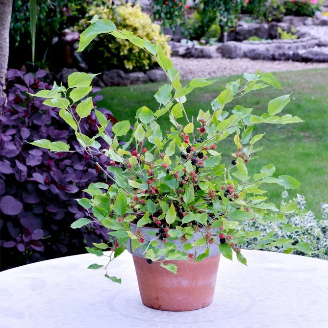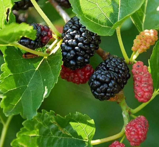 - Шелковица карликовая «Моджо Берри» Mojo Berry принадлежит виду Morus rotundiloba. Это недавно появившийся сорт, образующий густой куст компактного размера, идеально подходящий также для выращивания в горшках на террасе, балконе. Куст способен плодоносить на однолетней древесине (молодых побегах предыдущего сезона), дает плоды с лета до осени. Удивительно простой в уходе сорт, выносливый, очень устойчив к болезням. Период цветения: апрель-август. Высота дерева в зрелом возрасте – 1,5 м.