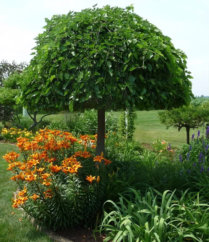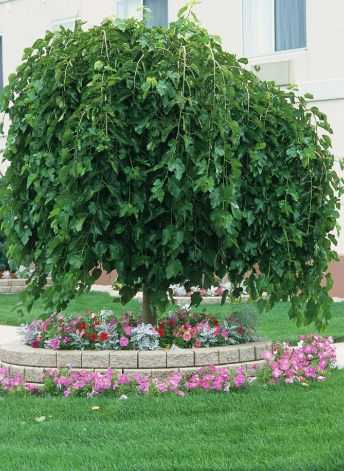 Шелковица с ее необычной кроной будет центром внимания в центре газона. В ее благодатной тени у основания можно посадить несколько растений: