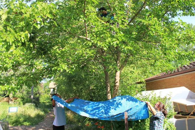 Чтобы собрать плоды шелковицы, просто натяните ткань под деревом и осторожно встряхните его.