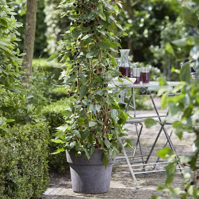 Карликовую шелковицу, например, удивительный сорт «Моджо Берри» Mojo Berry можно посадить в горшке на балконе. Это тутовое дерево остается очень маленьким, но дает вкусные плоды все лето. Рядом, в другом горшке, можно посадить очаровательную карликовую сливу «Голдаст» или самоплодный инжир «Ледяной кристалл» ‘Ice Crystal’.