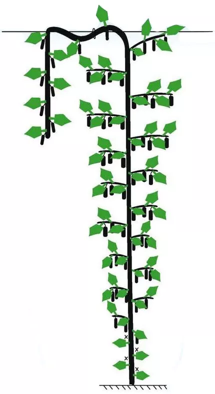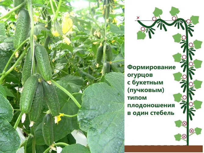 У индетерминантных огуречных сортов завязи формируются в основном на боковых побегах, поэтому главное внимание следует уделять именно им. Формирование куста на шпалере ведут по следующей схеме: