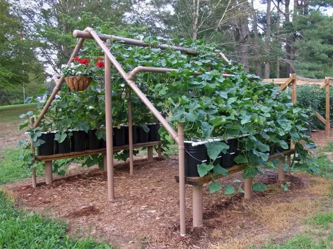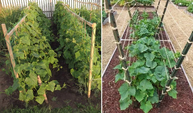 - На шпалере. Она может быть деревянной и оригинально оформленной. Можно высадить ряд огурцов, отступив от сетки или забора 25 см и протянуть от них к верху забора косые верёвочки. Со временем лианы покроют весь забор.