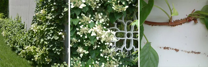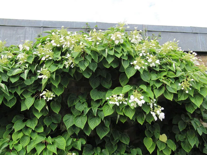 Очень сильнорослая лиана Схизофрагма Фори (Schizophragma fauriei) цветет во второй половине лета, достигая длины побегов 15 м. Не инвазивный вид с густыми, толстыми ветвями. Несмотря на простоту, идеально подходит для того, чтобы скрыть большую неприглядную стену.