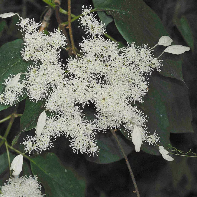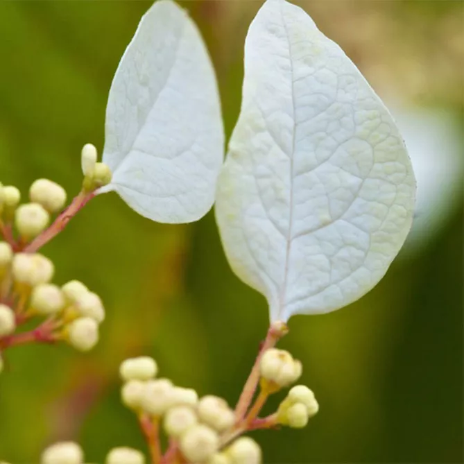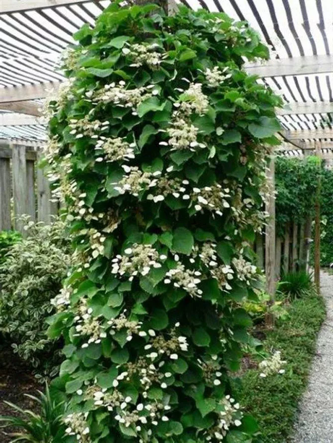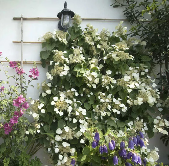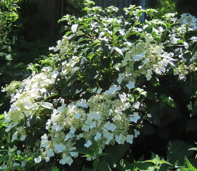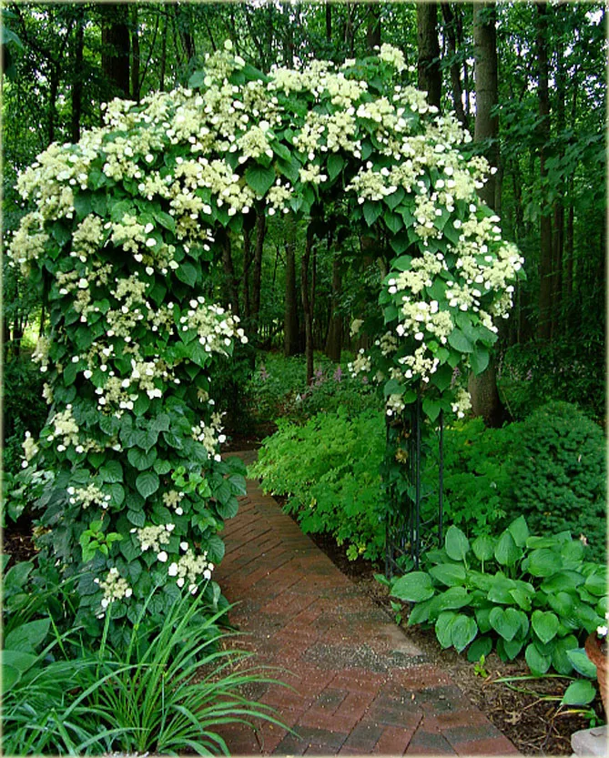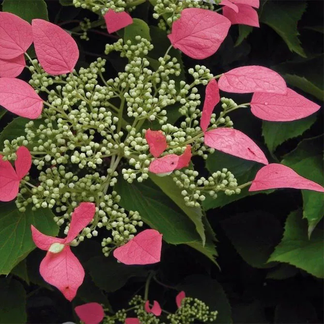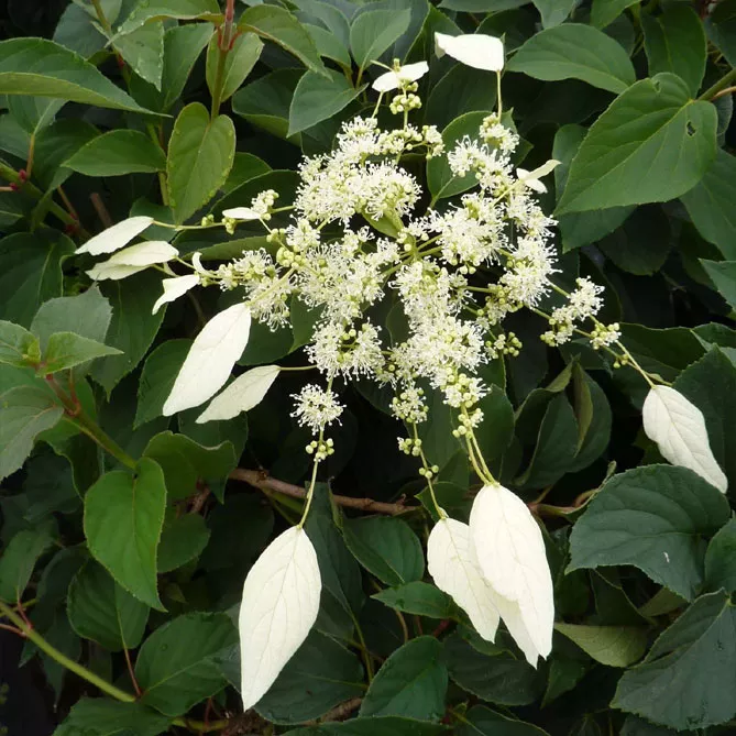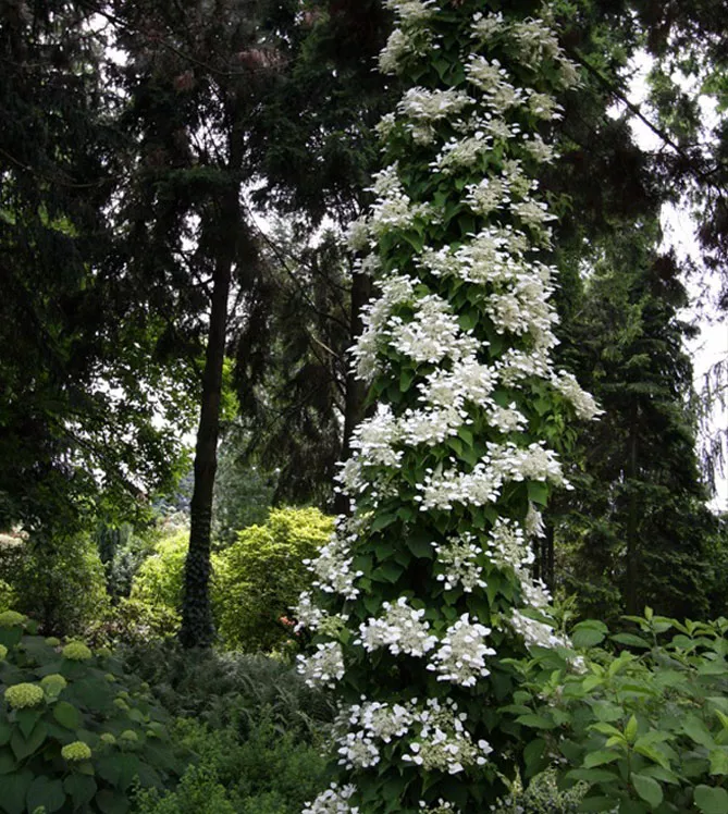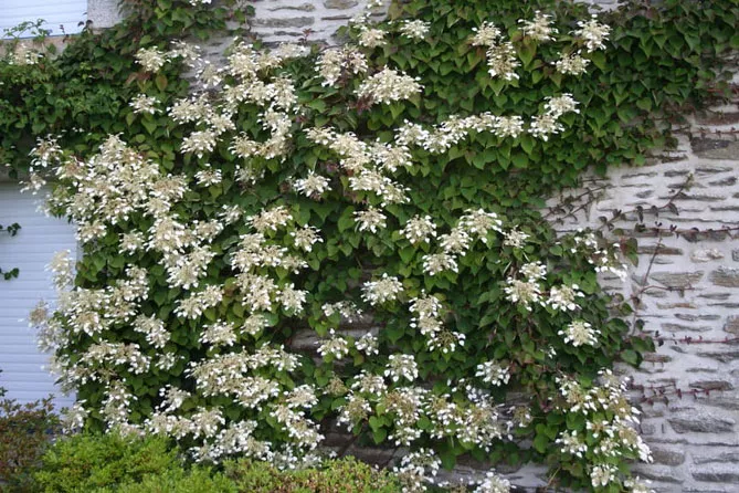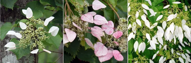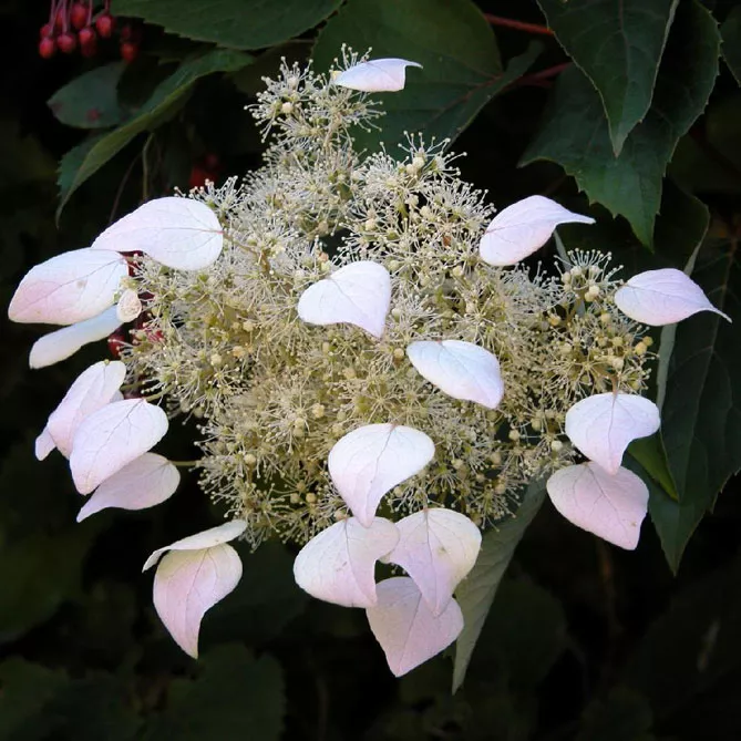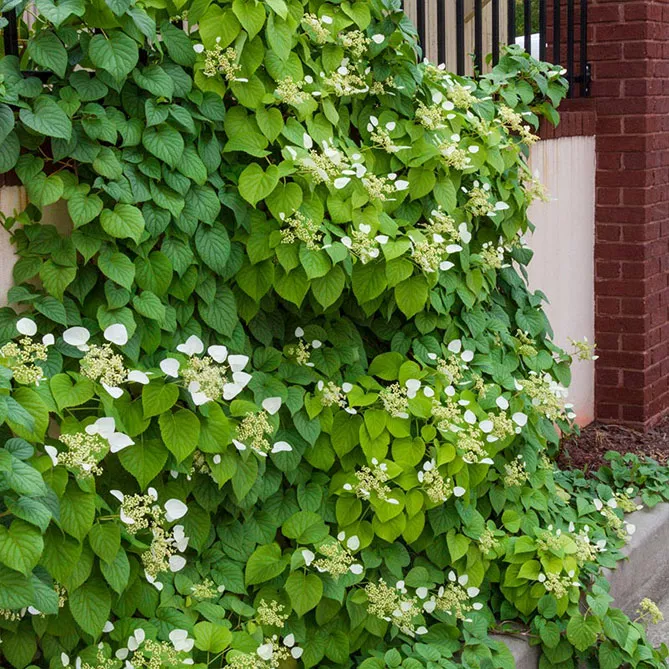 Довольно близкая по внешнему виду к гортензии вьющейся (черешковой) и часто путаемая с ней, эта «ложная вьющаяся гортензия» предлагает более эффектное цветение, которое может длиться до 3 недель.