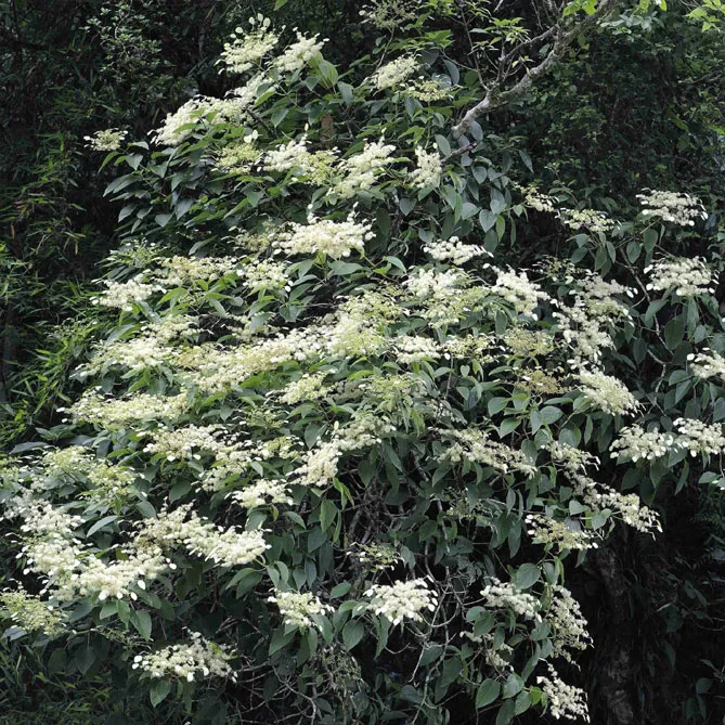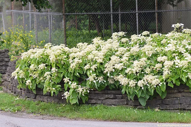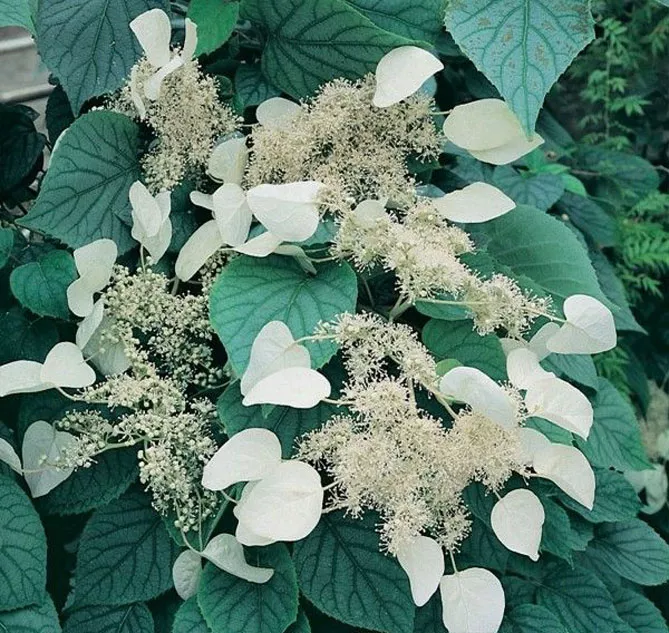 Схизофрагма лещинолистная (Schizophragma corylifolium) – самый ранний вид, цветет в конце весны или начале лета (обычно с мая по июль). Светло-зеленая листва похожа на листья лещины, отсюда и название. Кремовые цветы придают кустарнику естественное, романтическое очарование. Достигает 4 м.