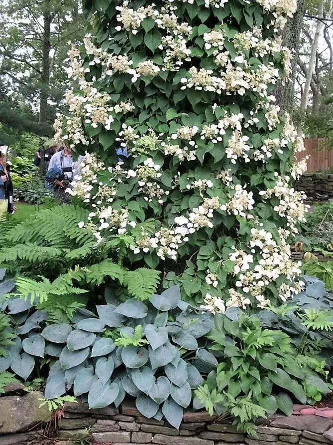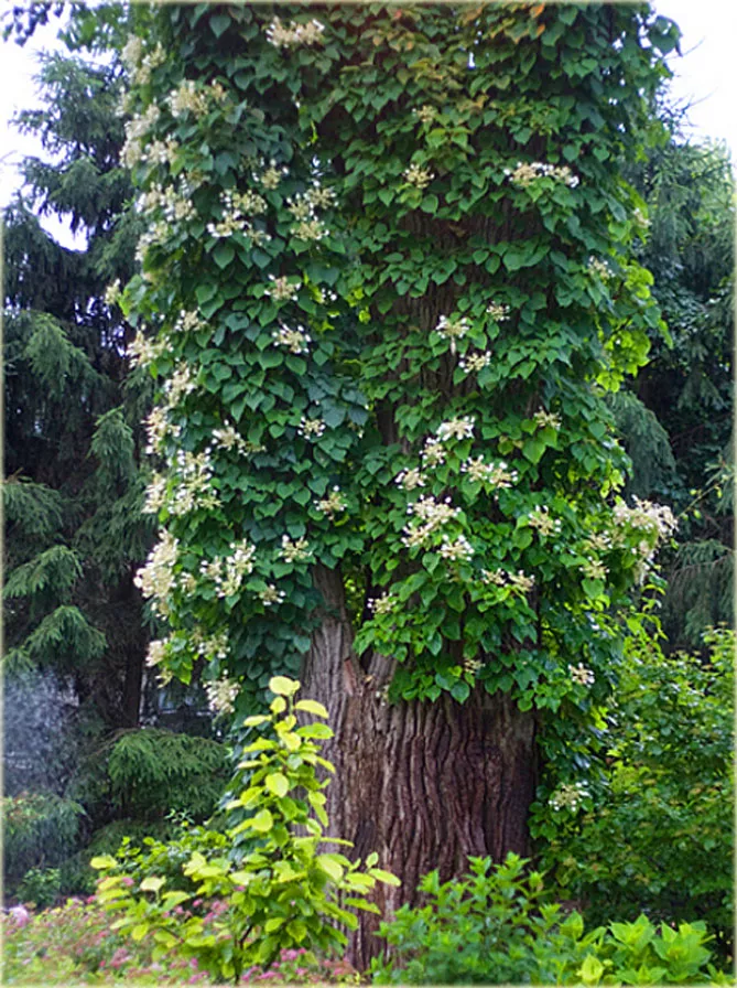 Фото. Пример комбинации в подлеске: схизофрагма гортензиевидная взбирается на дерево с гортензией крупнолистной у его основания и ковром из яснотки в качестве почвенного покрова.