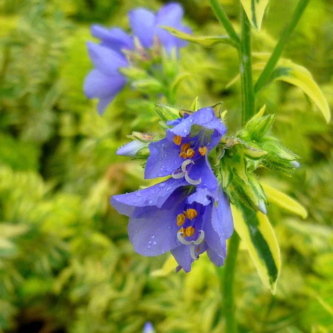 - «Лестница в небеса» Stairway to heavens. Сорт отличается бледно-голубыми цветами, цветущими в мае-июне и великолепной пестрой листвой. Высота растения: 40 см.