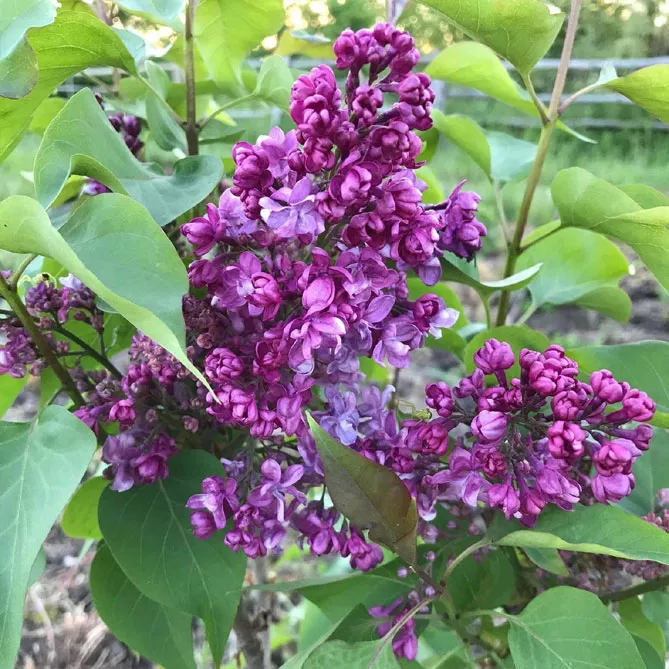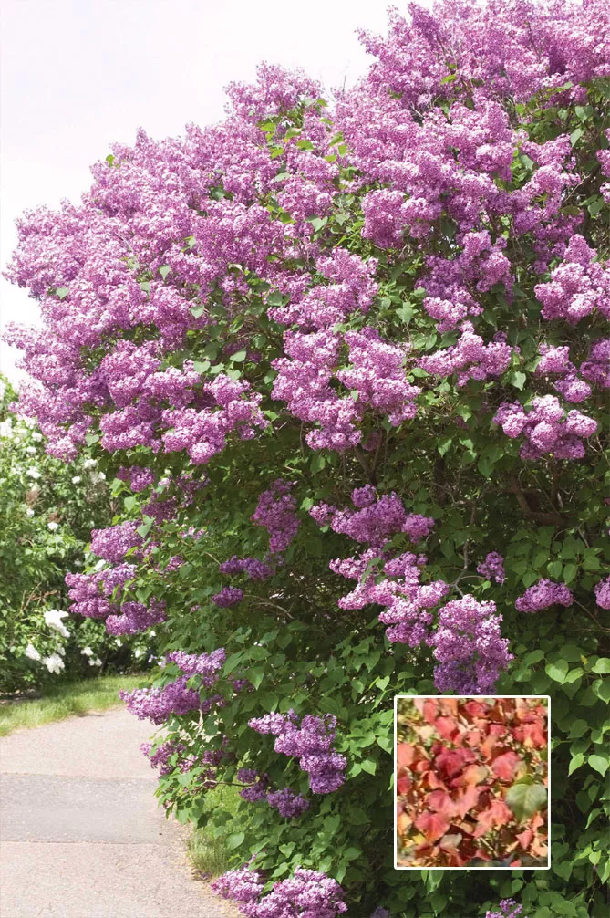 Насыщенная фиолетово-сливовая сирень хорошо сочетается с пурпурной листвой лавровишни, барбариса или более бледной сирени.