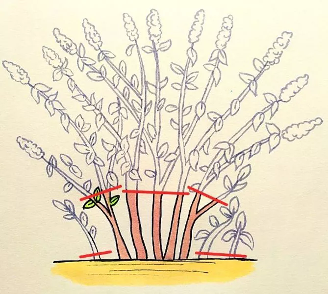 Рекомендуется обрезать каждый год, чтобы спровоцировать появление новых стеблей. Используйте секатор и удалите отцветшие цветы примерно на 30 см ниже соцветий. Удалите побеги, которые образуются у подножия кустарника, потому что они могут его истощать.