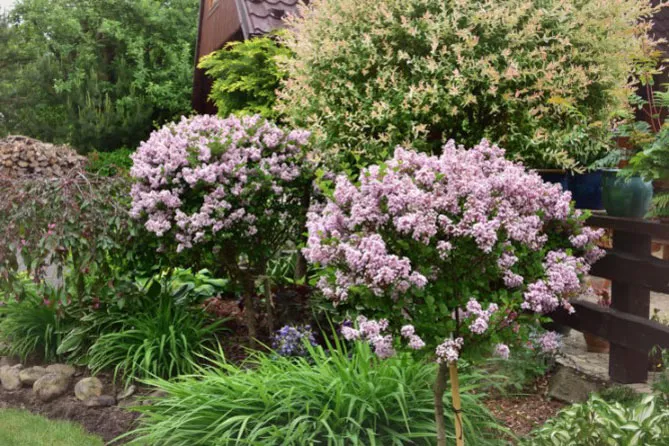 Поиграйте с разными сортами сирени, чтобы создать по-настоящему красочную рощу. Красиво выглядит в саду штамбовая сирень.