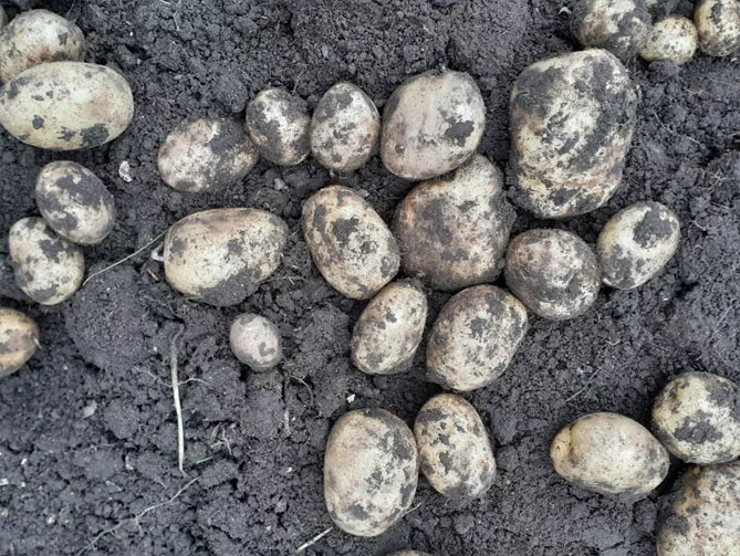 Выкопку проводят вилами или лопатой, некоторые дачники при значительных площадях посадки используют для копки мотоблок. Клубни 2-3 часа подсушивают на грядках, затем на 2 недели переносят под навес или в хорошо проветриваемое помещение. Картофель готов к хранению.