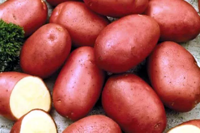 Уже по названию понятно – кожура плода имеет красный цвет. А вот мякоть светло-желтая. Этот сорт любят хозяюшки. Объяснить это легко – клубни ровные, чуть продолговатые, массой 100-120 грамм. Глазки у картошки небольшие, почти незаметные.