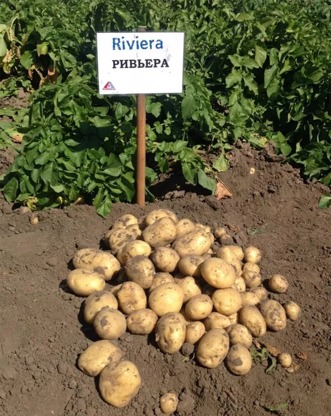 Согласно характеристикам и отзывам клубни картофеля сорта Ривьера продолговатой формы с мякотью желтого цвета. Глазки в поверхность кожуры заглублены не сильно. Среднее количество клубней на кусте около 10 штук. При соблюдении агротехники масса каждого клубня может достигать 200 грамм. По своим характеристикам сорт картофеля Ривьера можно сравнить с Жуковским ранним. Благодаря хорошим вкусовым качествам эта картошка отлично подходит для жарки, приготовления пюре, супов.