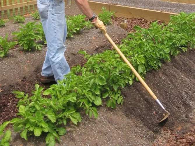 - Окучивание. Когда ботва картофеля Розара достигнет 15-20 см, куст начинают окучивать. Делают это раз в неделю, пока холмик достигнет высоты 20 см.
