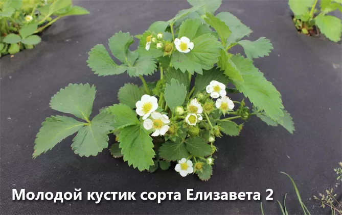Бутоны Елизаветы 2 белые, некрупные, обоеполые, собраны по несколько штук. Цветоносы раскидистые, заметно короче листьев, поэтому при уплотненной посадке плоды могут затеняться и плохо вызревать. Под тяжестью ягод они нередко ложатся на землю.